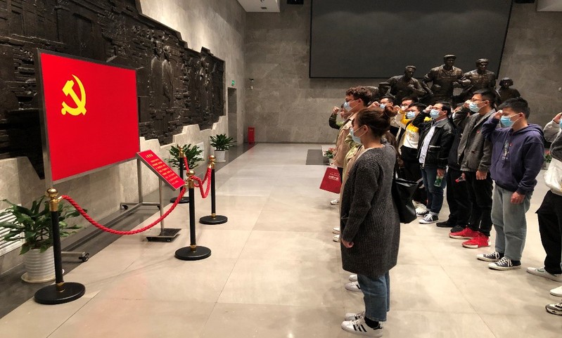 活动开始,在中共四大纪念馆大厅内,以支部为单位,在庄严的党旗下全体研究生新生党员重温入党誓词并宣誓。作为一名党员,入党誓词就是行为准则,重温入党誓词就是警醒自己勿忘初心,恪守承诺。作为一名研究生,上海工程技术大学是新的起点,学习知识,将科技与创新转化为实践,投身“十四五”建设发展。