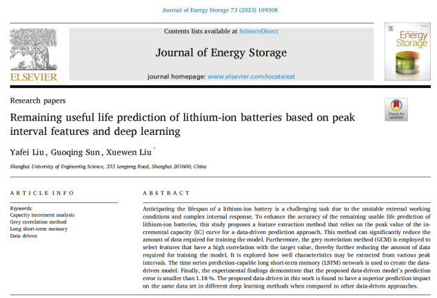 近日,yl23411永利集团官网人工智能计算力学与工程研究所刘学文高工(通讯作者)指导研究生刘亚飞在国际知名期刊《Journal of Energy Storage》(影响因子9.4)上发表论文Remaining useful life prediction of lithium-ion batteries based on peak interval features and deep learning。