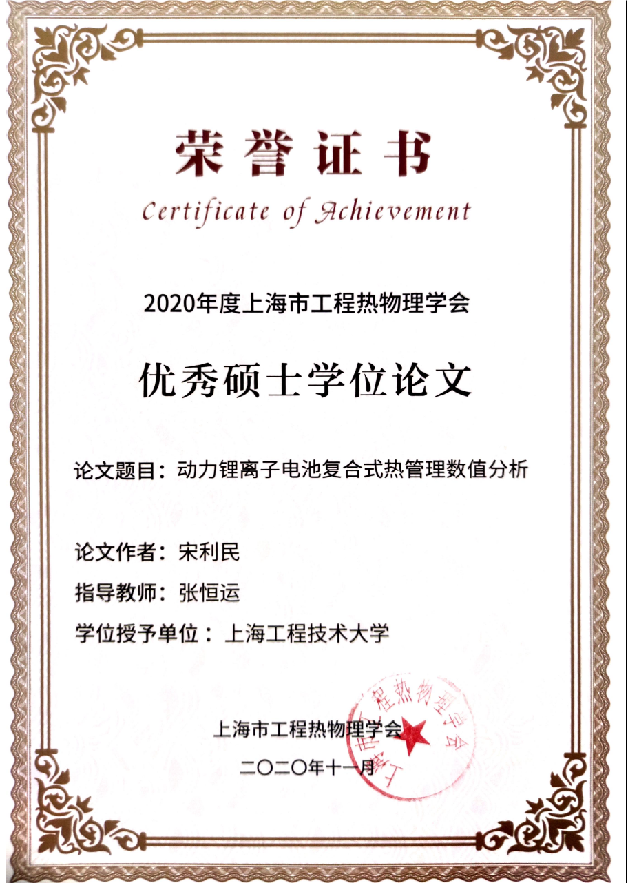 上海市工程热物理学会第九届会员代表大会于2020年11月29日在上海交通大学召开,会上颁发了2020年度上海市工程热物理学会优秀博士学位论文奖和优秀硕士学位论文奖,永利集团官网yl23411永利集团官网宋利民同学的硕士学位论文《动力锂离子电池复合式热管理数值分析》,荣获学会优秀硕士学位论文奖,指导老师为张恒运教授。本届参评论文为2018年1月1日至2020年6月30日获得博士硕士学位者的学位论文。