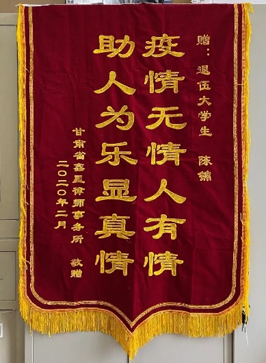 疫情期间,陈锦同学成功购得各型号平价口罩数千个并将它们送到当地律师事务所、退休老职工、个体工商户、城区派出所等单位和个人手中,解决他们的防疫之需。即便好多人素不相识,陈锦也是热情帮助,甚至自己垫付一万多元货款,陈锦说:“我可是个退伍兵,退伍不褪色,我永远不会忘记自己是个兵!”
