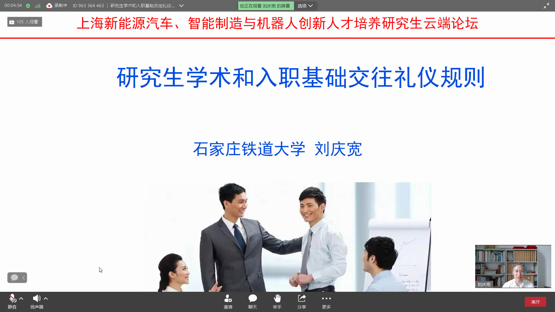 2024年9月7日上午9时,石家庄铁道大学工程研究中心主任,国家百千万 人才、教育部新世纪优秀人才,博士生导师刘庆宽教授以《研究生学术和入职基础交往礼仪规则》为题,为暑期学校的学员们开展了线上专题讲座。本次讲座由yl23411永利集团官网副院长刘新田教授主持。