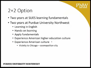 在会上,Athula Kulatunga教授首先两校间的合作进行了详细的介绍,并对普渡大学西北分校进行简要的介绍,通过PPT详细介绍学校位置规模、交通、办学特色、学校排名等情况,并主要讲解了2+2双学位项目所涉及的专业包括电气工程技术、机械工程技术和机电工程技术等方向。
