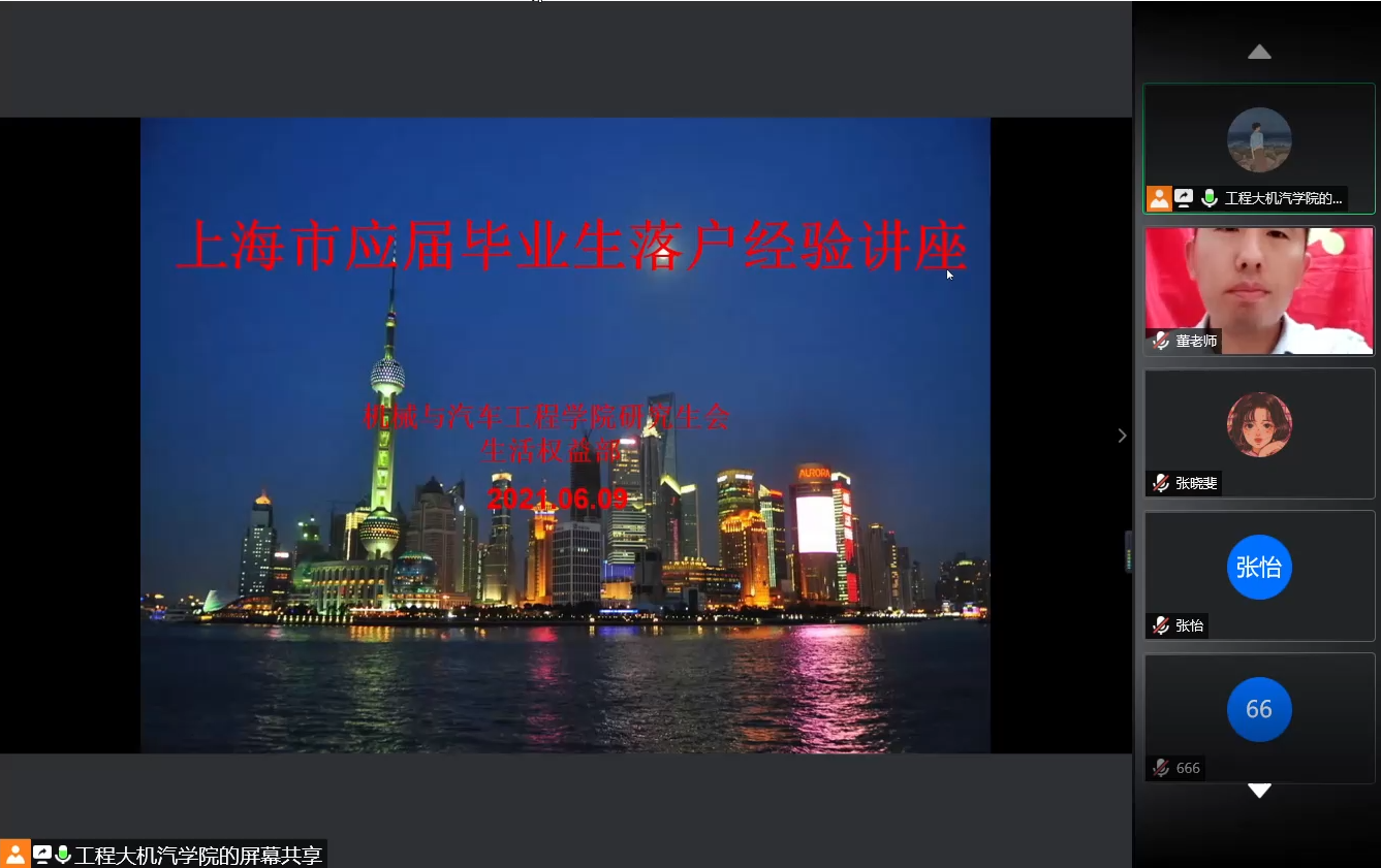 为了帮助学院有意向落户上海的毕业生同学们了解落户政策,知晓后续落户申请、落户批复等过程中需要注意的问题,yl23411永利集团官网于6月9日晚上8点在线上腾讯会议室举办了上海市落户经验交流分享会。此次落户经验交流分享会是机设能源交通研究生联合党支部开展的“我为群众办实事”重要项目。本次活动邀请了去年毕业成功落户的孙观学长和杨云露学姐,他们为参会的毕业生同学分享了自己从准备落户材料到最后成功落户的具体细节和注意事项。