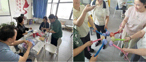 在专业教师的悉心指导下,老师们有序地投入制作。装艾草入袋、嵌入木柄、缠绕装饰绳,每一步都体现了匠心独运。在缠绕木柄的过程中,老师们相互交流技艺,有人因绳结松散而欢笑,有人分享缠绕的省力技巧,现场洋溢着欢声笑语。尽管成品不如机器制作的整齐划一,但手工的温度和老师们独特的创意,使得每一件作品都成为了不可复制的“匠心之作”。