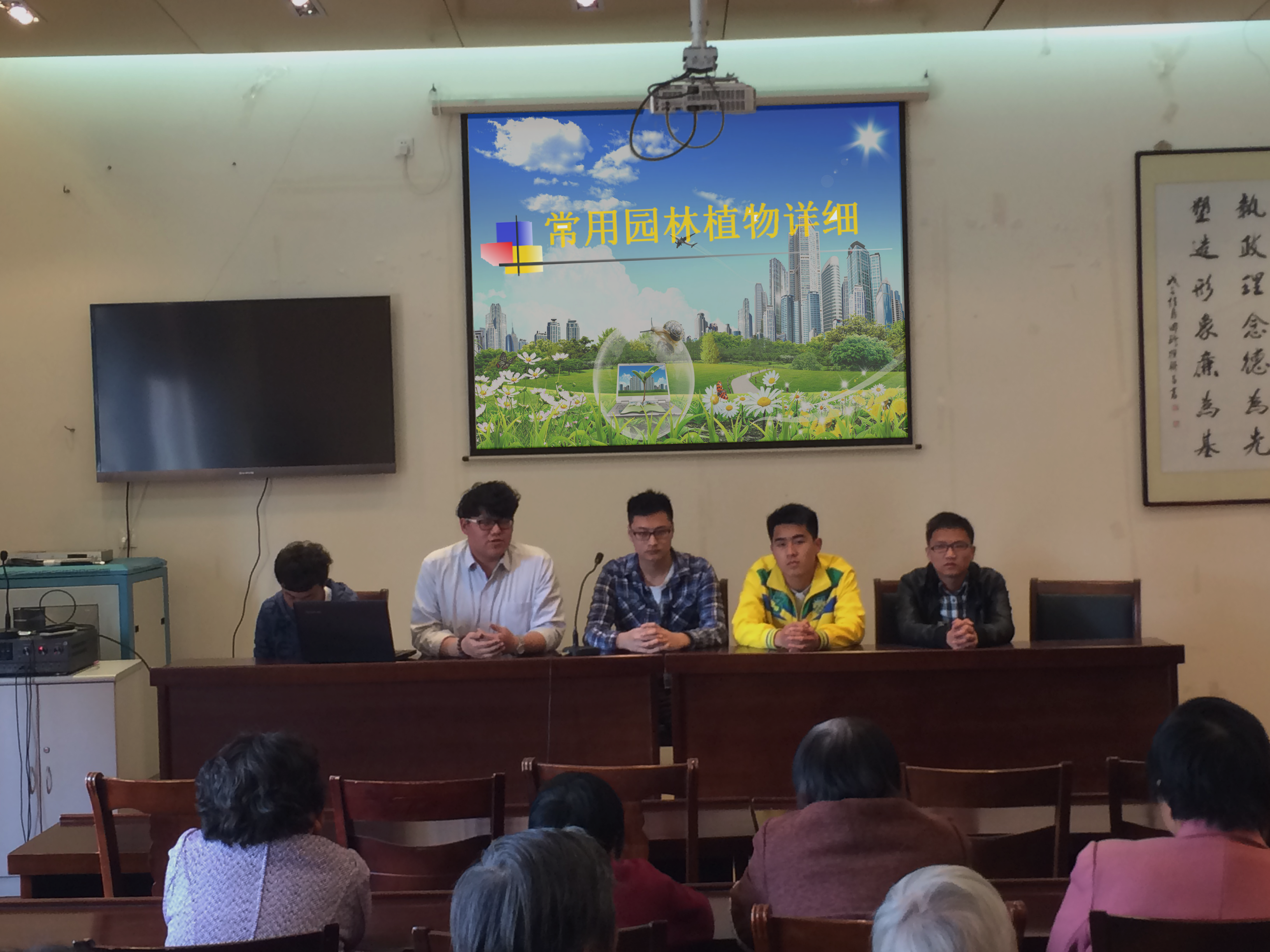 学院志愿者们经过几周的努力,设计出了ppt“常用园林植物详细”,不仅让泗泾街道润江居委会的叔叔阿姨们对环境保护有了更深一步的认识。更增强了叔叔阿姨们节能环保的意识,开拓了科学视野,受益匪浅。同学们把对环保的热情带到了居委会各位叔叔阿姨的身边。