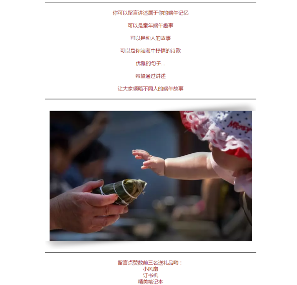 在线下,学院学生会宣传部制作了精美的宣传海报,张贴在学院公告栏、宿舍园区等处,让学生了解这一传统佳节,感受端午佳节即将到来的氛围。线上,学院通过学院微信平台推送了端午节的相关知识,主要包括端午佳节的来源、传统习俗等内容。同时在线上组织了关于端午佳节的留言,征集学生对于端午佳节的所思所想所感,为学生提供沟通的平台。