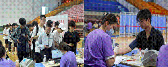 热血守护生命,大爱传递真情。6月3日,yl23411永利集团官网徐华源、袁涛老师以及200余名学生在学校体育馆参加2025年无偿献血活动。