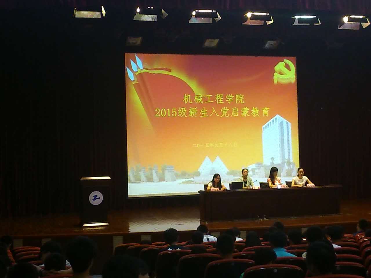 20150918日下午,上海工程技术大学机械工程学院党委在志宏堂召开2015级新生入党启蒙教育大会,学院党委书记虞蓉、副书记梅元媛、学生科创党支部柳苗苗以及组织员李雪苗出席会议。