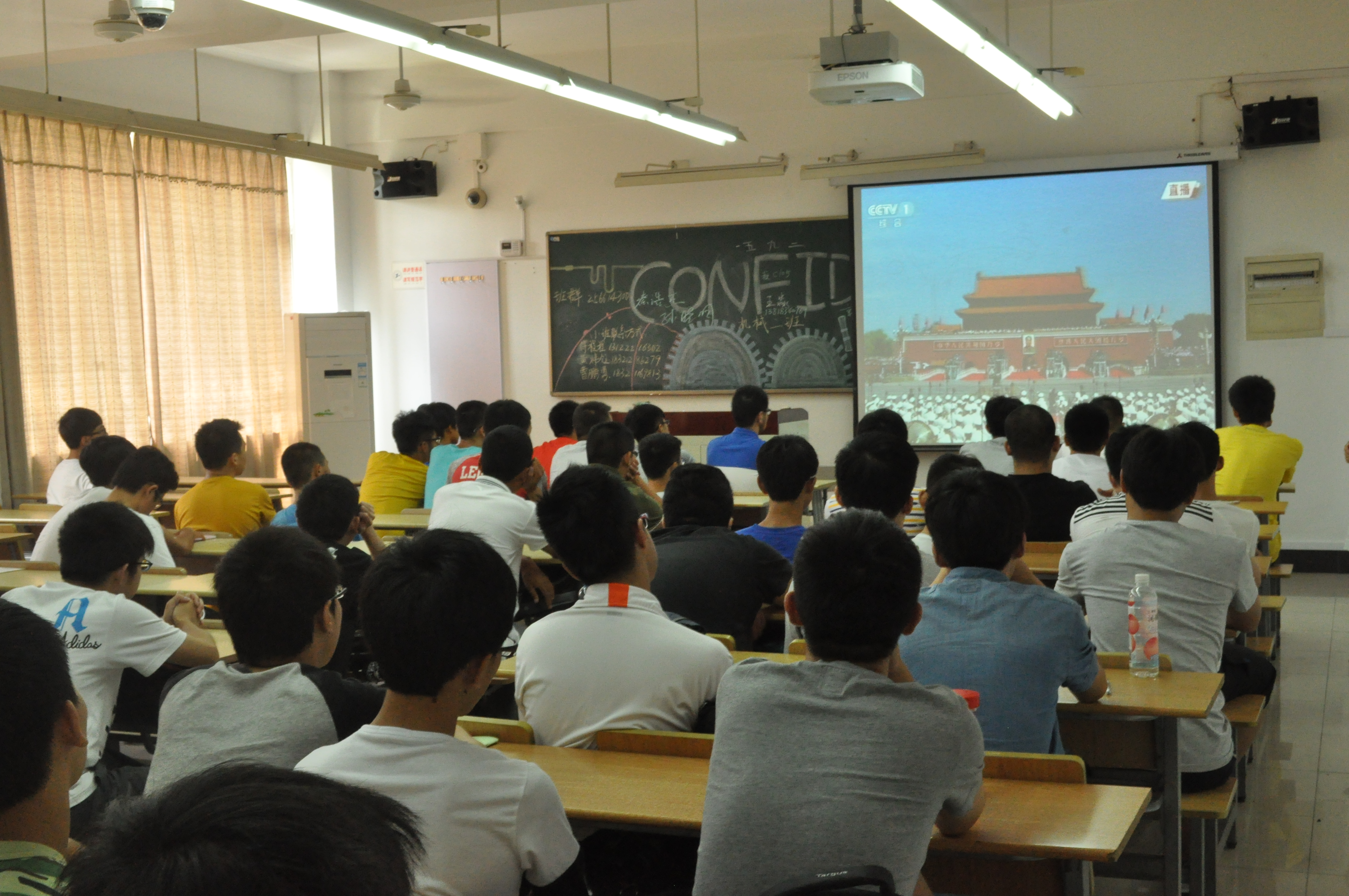 在观看阅兵仪式的整个过程中,每位同学都聚精会神,通过这次阅兵仪式他们见识了国家强大的军事实力,每位同学都为自己的国家感到自豪与骄傲。