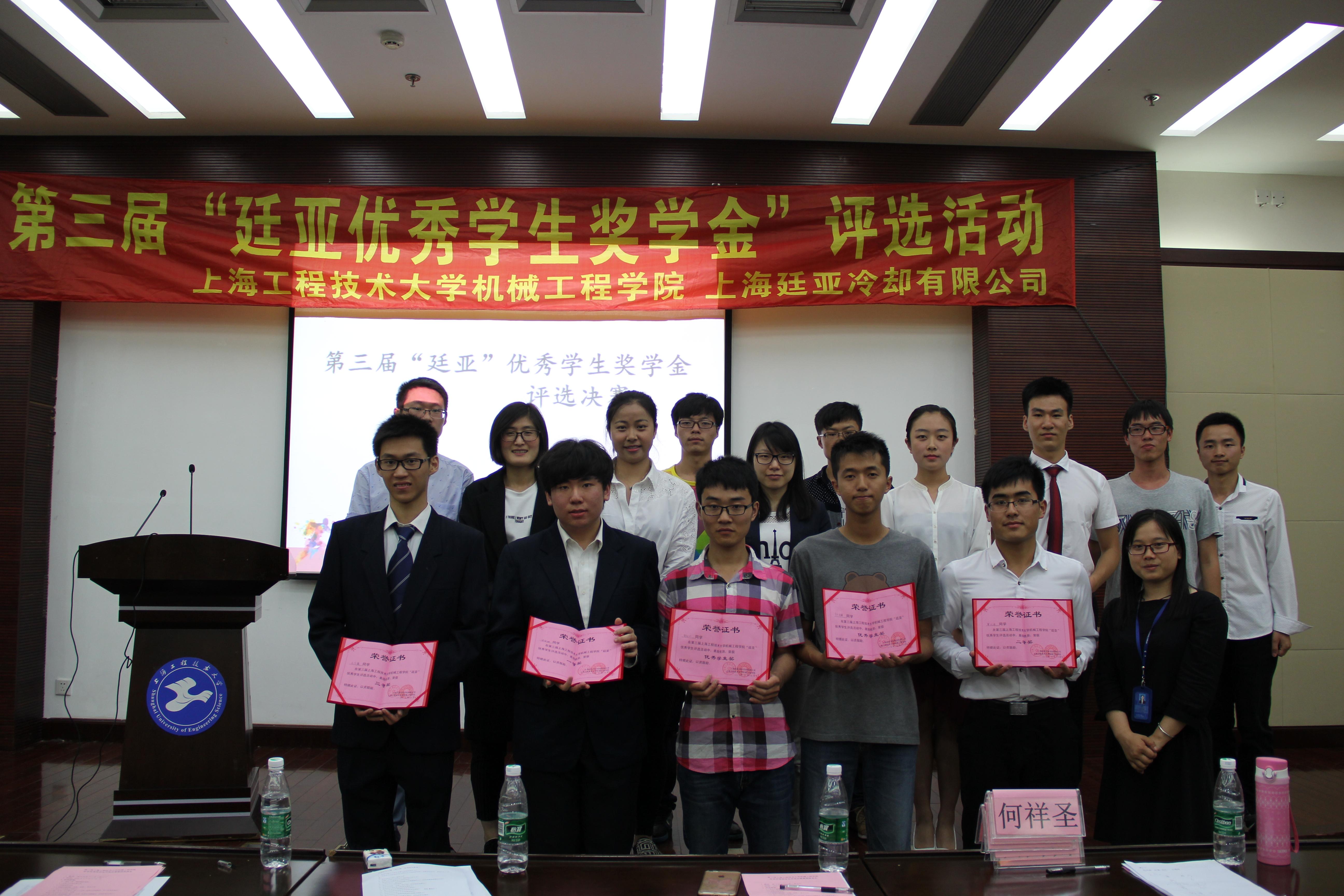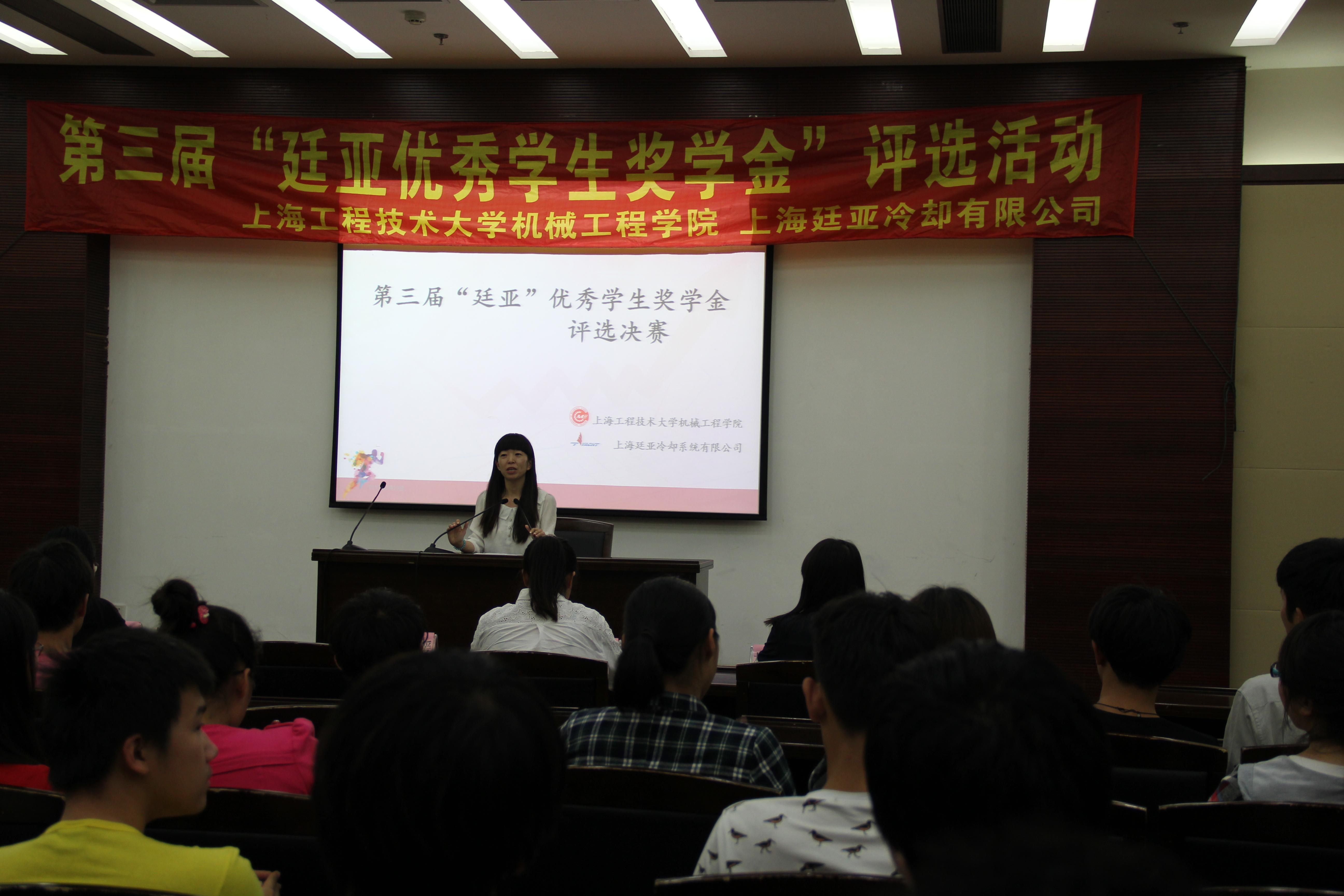 2015529日下午2点,机械工程学院在图文信息中心第三报告厅举办第二届上海工程技术大学廷亚优秀奖学金评选总决赛暨颁奖典礼,机械工程学院党委副书记梅元媛老师、上海廷亚冷却系统有限公司市场部经理宣琳娜、机械工程学院辅导员王淼、柳苗苗老师出席了此次活动。