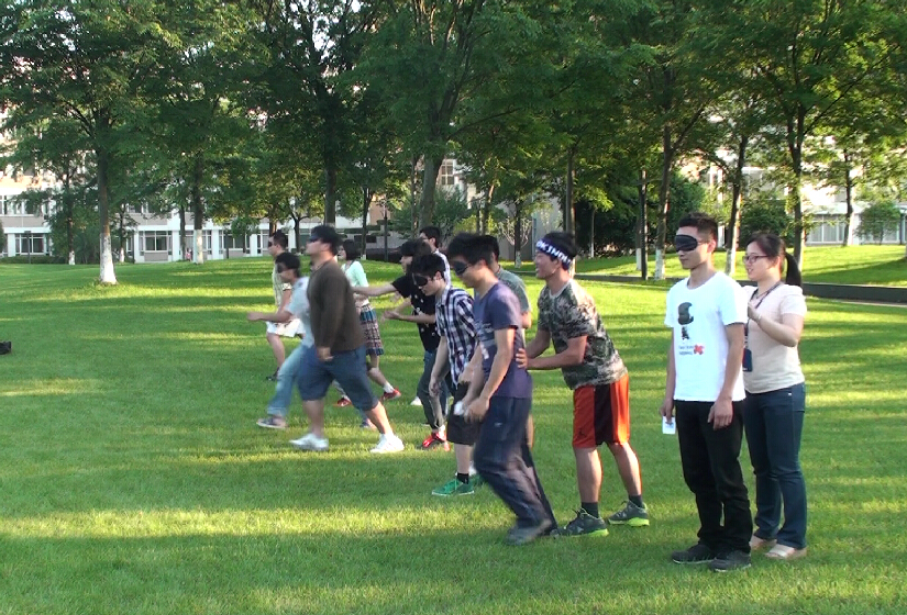 接下来第二个团辅游戏是“盲人拐杖”,将成员分成8组,每组3人,每组选出一位队员作为“盲人”,其余两位队员分别站在起点和终点,由每组的盲人完成由起点到终点换纸牌任务,用时最短的组获胜。这个游戏让每个同学深刻感受到在合作中信任的重要作用。