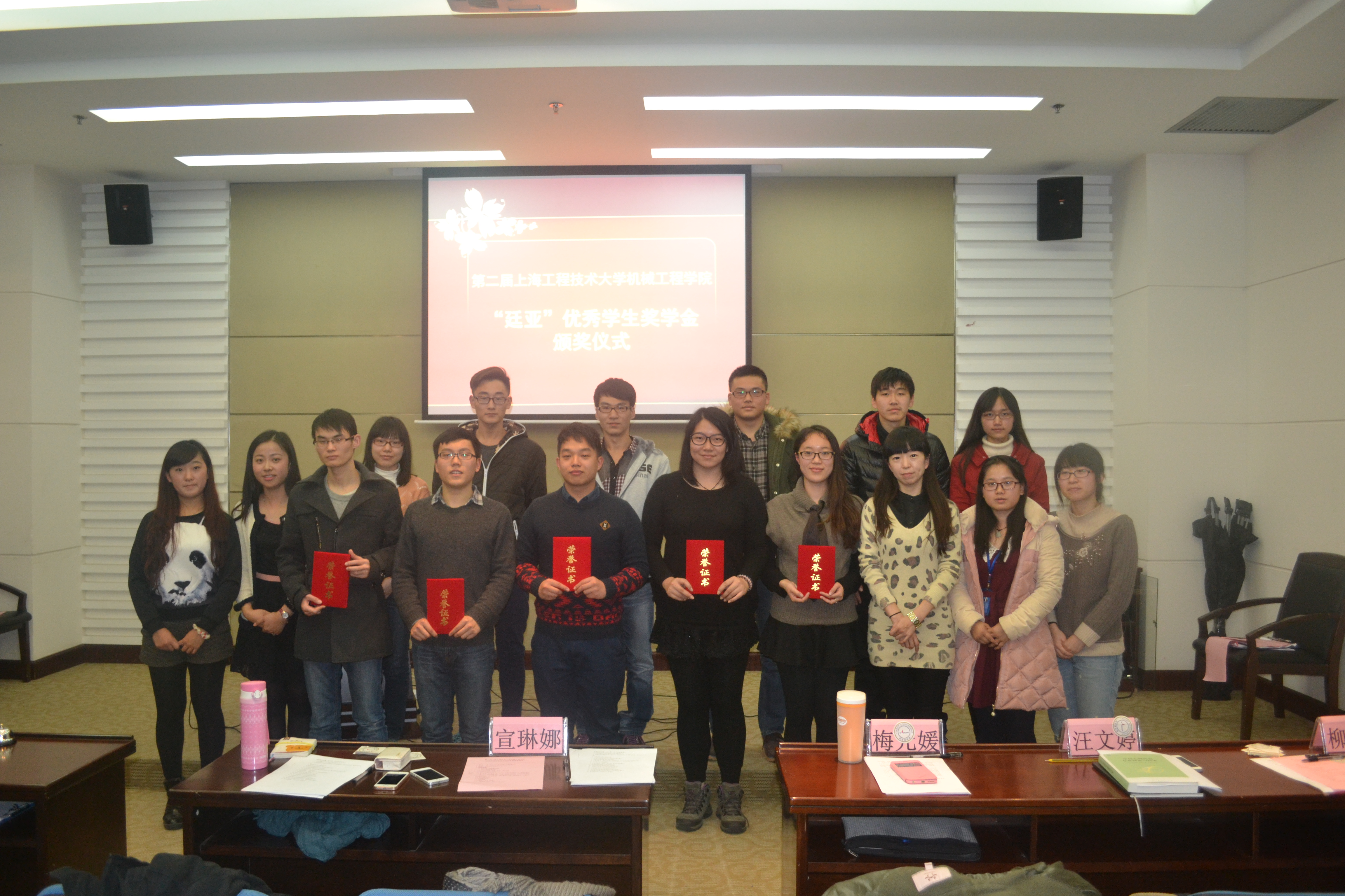 2014年12月29日下午1点,机械工程学院在图文信息中心第四报告厅举办第二届上海工程技术大学廷亚优秀奖学金评选总决赛暨颁奖典礼,机械工程学院党委副书记梅元媛老师、上海廷亚冷却系统有限公司市场部经理宣琳娜、机械工程学院辅导员汪文婷、柳苗苗老师出席了此次活动。