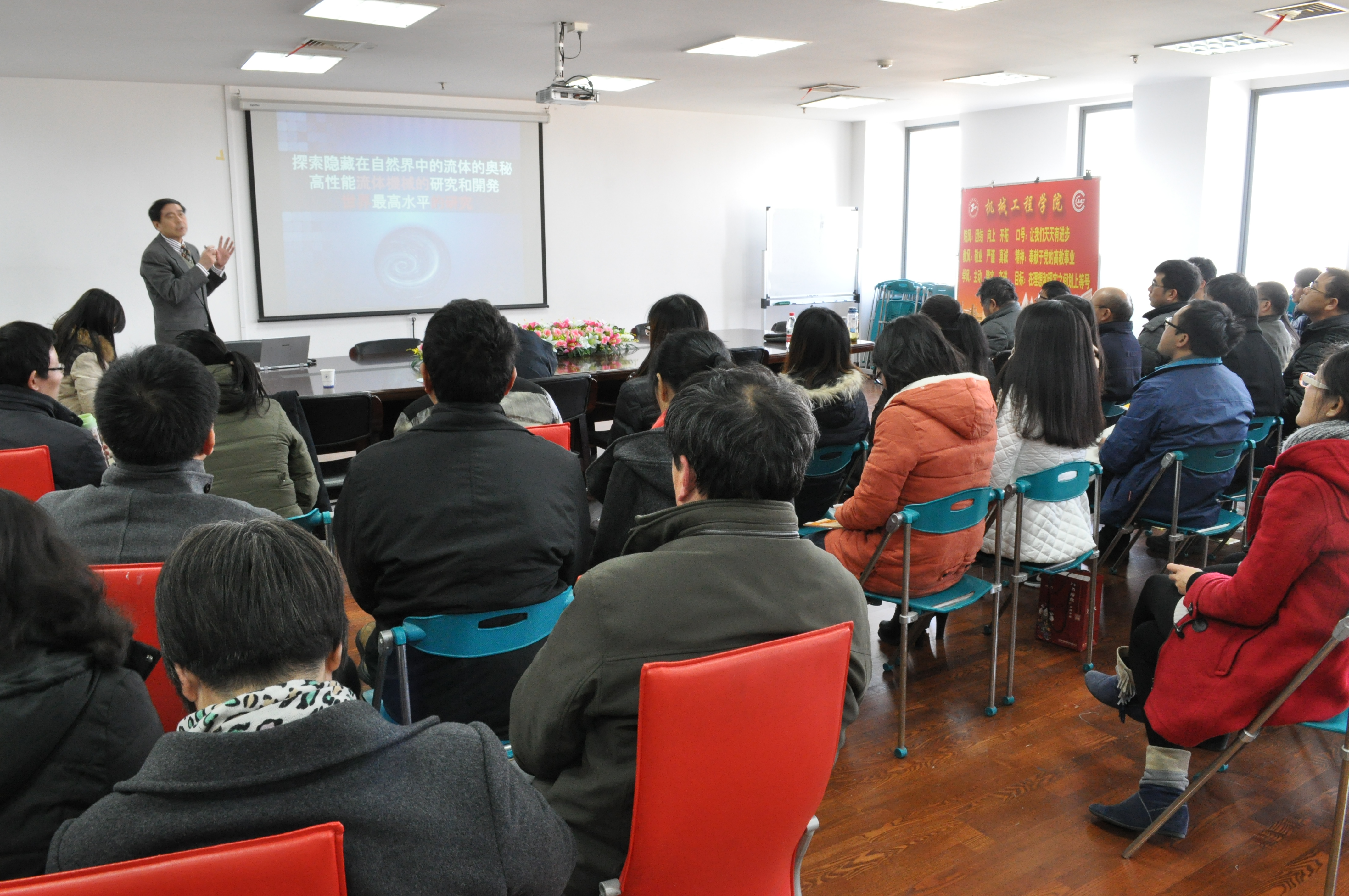 座谈会开始,李教授作了题为“探索隐藏在自然界中的流体的奥秘,高性能流体机械的研究和开发”报告。在报告中,教授首先通过若干生动有趣的图片介绍了生体模仿学的发展历史和研究现状,立刻引起了到会师生的浓厚兴趣。接着,教授介绍了他所在日本山形大学机械系统工程系在流体力学领域的科研工作,以及在多尺度紊流构造、气固二相流等方面取得的成绩。最后李教授以从实际出发,以蜻蜓和水黾为例,介绍了其在仿生流体力学以及紊动現现象的应用研究。