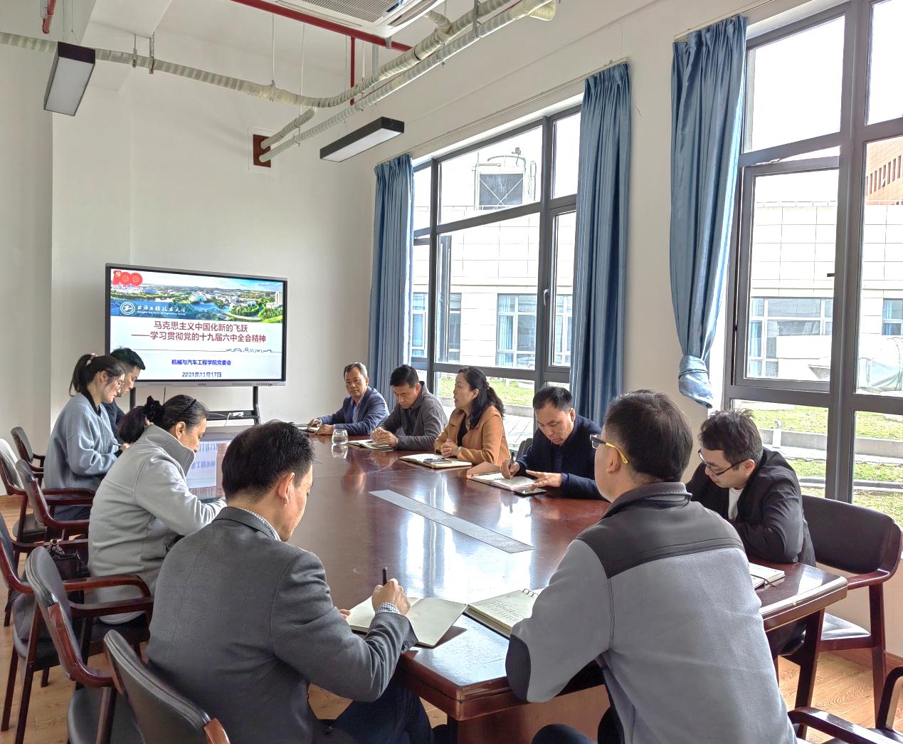 11月17日,yl23411永利集团官网(以下简称“机汽学院”)在交通大楼8B656召开学院中心组(扩大)学习会,学习贯彻十九届六中全会精神。此次中心组学习采取学院班子成员领学、相互交流的方式进行。会上副院长严祯荣以《马克思主义中国化新的飞跃》为题,领学学习十九届六中全会精神的学习感悟。学院中心组成员、党委委员以及支部书记参加等参加会议。会议由机汽学院党委书记虞蓉主持。