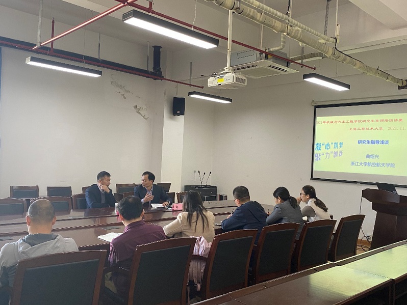 首先,郭辉副院长向与会的四十余名师生简要地介绍了曲绍兴教授。然后,曲教授分享了“凝心筑梦,聚力创新”为主题的研究生培养经验。曲教授结合其自身求学及指导研究生的经历,以及作为骨干成员获得浙江大学“五好”研究生导学团队的经验,从导师自身的学术与修为提升、研究生指导过程中应注意的事项谈起,以丰富实例阐述了团队文化、因材施教、交叉培养和国际化联合培养对等研究生指导的重要作用,为我院研究生导师在培养学生的方法方面提供了很好的参考。