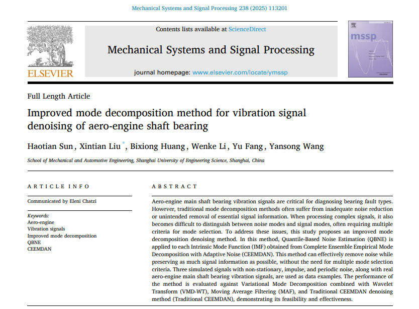 近日,yl23411永利集团官网刘新田教授指导研究生孙浩天在中科院一区期刊《Mechanical Systems and Signal Processing》(2025IF=8.9)上发表了题为“Improved mode decomposition method for vibration signal denoising of aero-engine shaft bearing”的研究论文。