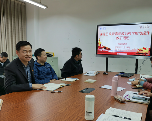 为充分贯彻教育部高等学校课程思政建设指导纲要,有效提升青年教师课程思政育人水平,在yl23411永利集团官网党委指导和机械制造系教工党支部的支持下,机械制造系于11月26日下午13时齐聚实训楼4207会议室,举行课程思政暨青年教师教学能力提升教研活动,共谋课程思政教学新发展。学院党委副书记王东阳、机械制造系教工党支部书记苗晓丹出席活动,机械制造系主任张立强主持。