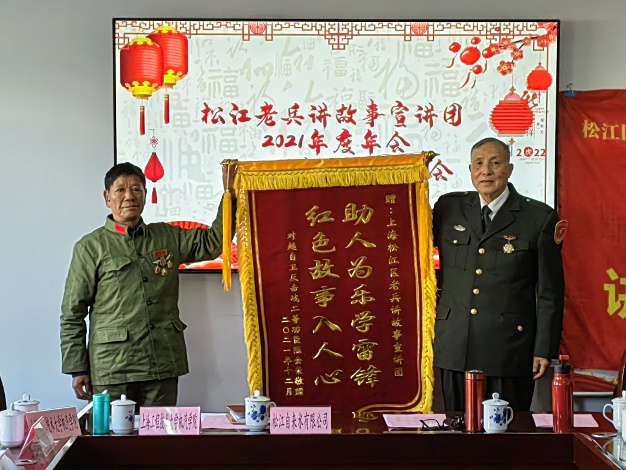 朱渭民团长向与会人员作2021年度老兵讲故事宣讲团工作汇报,他在回顾全年宣讲155场的好成绩时,感谢政府部门、相关学校和单位的支持和关爱,感谢团队全体老兵,不怕苦不怕累。他指出,团队要发展,要不断丰富形式,夯实宣讲内容,持续推进十九届六中全会精神宣传引向深入。同时他也向在场的区军人事务局、区委宣传部等部门提出希望,希望2022年有机会进军营、进警营宣讲,以老兵带新兵,讲好“红色故事”,赓续红色血脉。