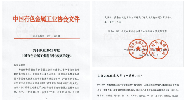 近日,中国有色金属工业协会发布了《关于颁发2021年度中国有色金属工业科学技术奖的通知》,由yl23411永利集团官网邓胜祥教授牵头申报的《有色冶金工业炉窑节能技术开发与应用》项目荣获中国有色金属工业科学技术奖一等奖。上海工程技术大学为该项目第一完成单位,参与单位包括中南大学、遵义铝业股份有限公司、贵州省六盘水双元铝业有限责任公司等单位。