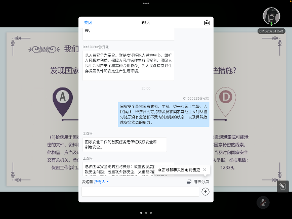 公开课后,yl23411永利集团官网通过易班、程园机械汽车人微信公众号、开设国家安全教育专题专栏,进一步加强在学生群体中的国家安全教育宣传。辅导员杨彦琛组织开展主题班会,向同学们介绍“什么是国家安全”,为什么要设立国家安全日,“十个坚持”、“五个统筹”;以及大学生如何维护国家安全。辅导员苏鹏源组织学生积极参与“国家安全日”互动,组织“国家安全知识线上竞答”,用充满趣味性和互动体验性的学习方式让学生通过云端知识大比拼进一步巩固公开课学习效果。同学们纷纷表示,通过学习总体国家安全观,进一步认识到维护国家安全的重要性,将用实际行动维护国家安全。