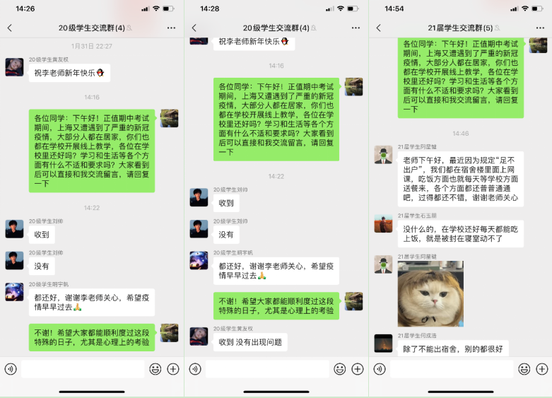 面对突发的疫情,机汽学院25个教学团队所有导师肩负起应有的责任,除了在学业上给学生指导,积极引导学生坚定疫情可防可控的信心,提醒学生注重个人防护,客观科学的认识疫情;对学生及存在困难和情绪的学生进行心理疏导,及时积极的解决反馈问题,让全体学生在对导师充满依赖感的同时,增强对学校的归属感。