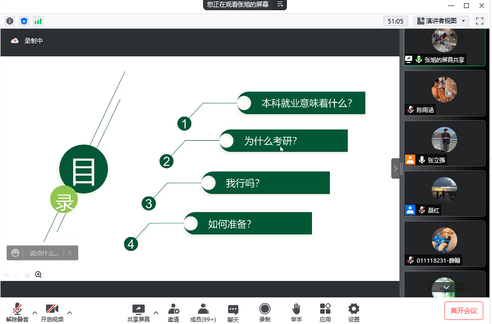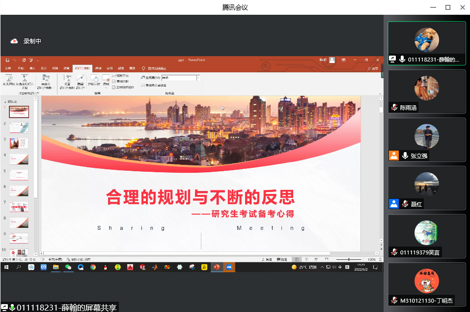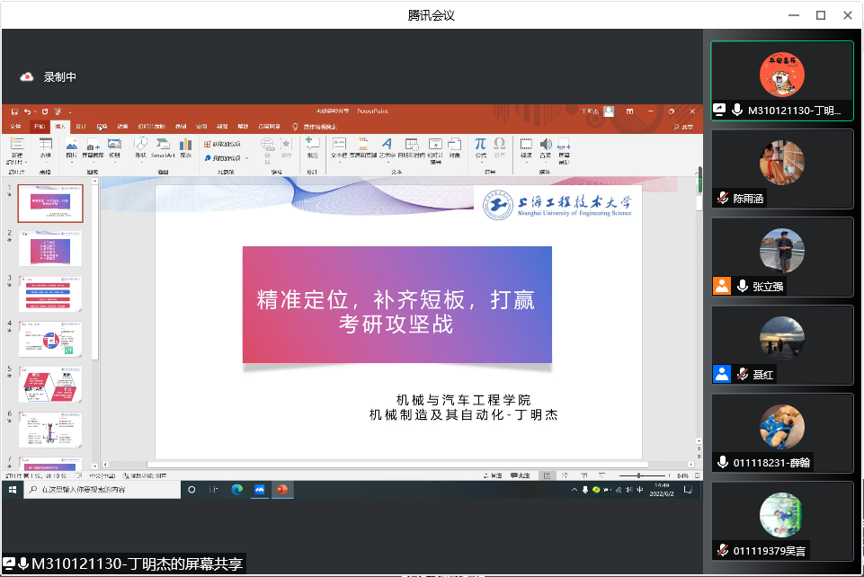 随后,已被同济大学录取的薛翰同学分享了他备考的心路历程,经验教训和上岸心得;永利集团官网研一在读的学长丁明杰分享了考研准备期信息的获取途径及后期每门课程的复习经验与方法,同时也建议学弟学妹们寻找研友,适当运动,以最好的状态迎接考试。