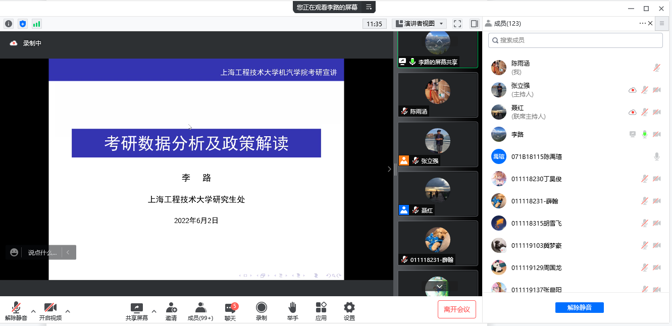 为营造良好学风,激发学生考研的积极性,增强同学们考研的信心,2022年6月2日下午,yl23411永利集团官网邀请了校研究生处副处长李路教授、我院机械设计系主任张旭教授、已被同济大学录取的我院本科生薛翰同学及我院研一学生丁明杰在腾讯会议召开了考研宣讲会,张立强副院长、辅导员及教务老师和我院2018、2019级有考研意向的同学近150人参加了本次宣讲会。会议由张立强副院长主持。