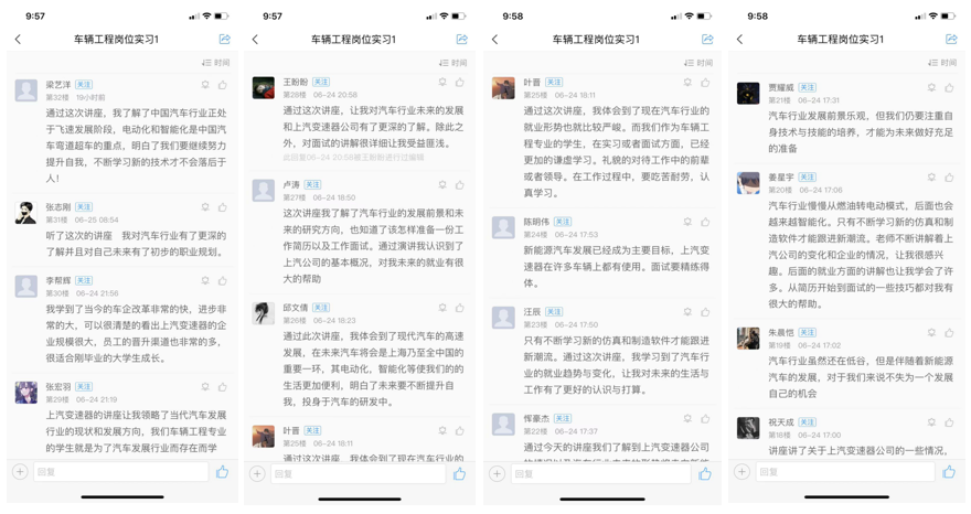 交流环节,面对同学们对新能源汽车需不需要变速器的疑问,徐经理详细介绍了变速器行业的发展方向和上汽变速器的求存发展路径。两个小时的讲座内容充实,增强了同学们对汽车行业的认识和专业自信,激发了同学们学习新知识的兴趣,同时也让同学们明白企业需要什么样的人才,如何提升自己并获得企业青睐。讲座结束,同学们纷纷在学习通留言,发表了对此次讲座的体会。