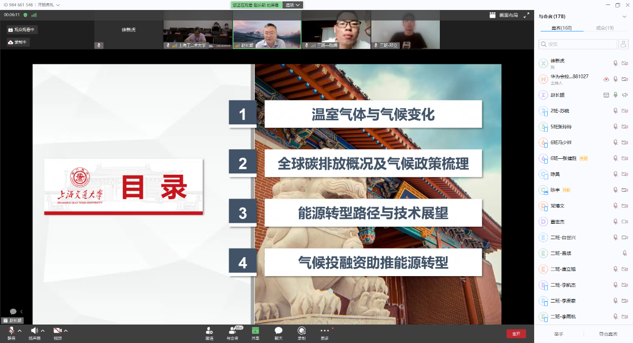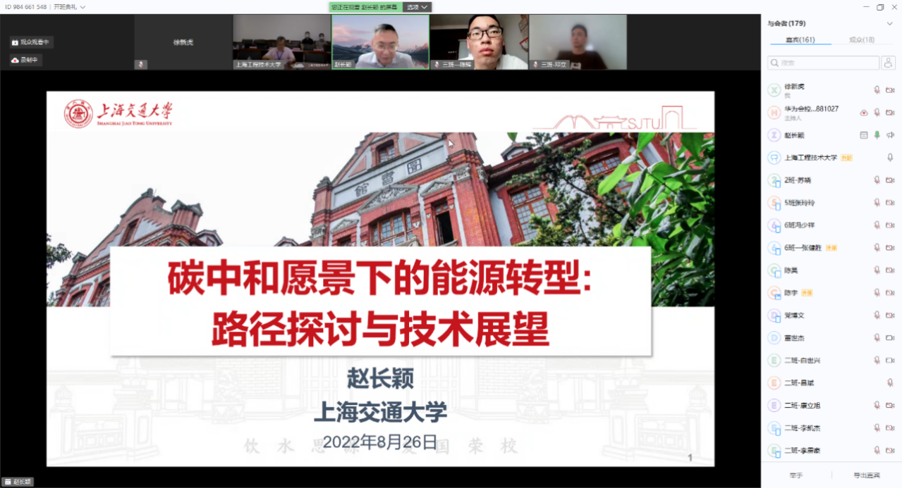 2022年8月22日上午,通过华为云会议视频平台,上海交通大学讲席教授、中英国际低碳学院院长、工程热物理研究所所长、国家特聘专家赵长颖为暑期学校做题为《双碳目标下的能源转型:路径探讨及技术展望》的线上专题讲座。讲座由yl23411永利集团官网副院长严祯荣主持。
