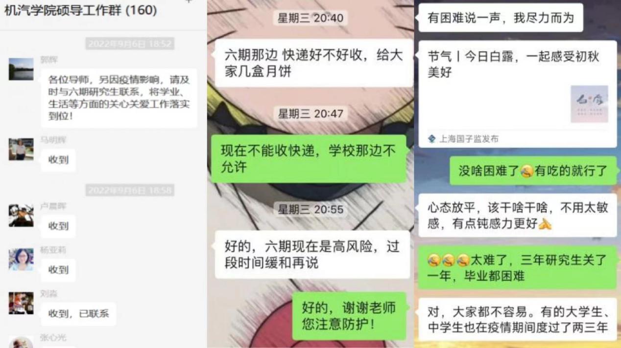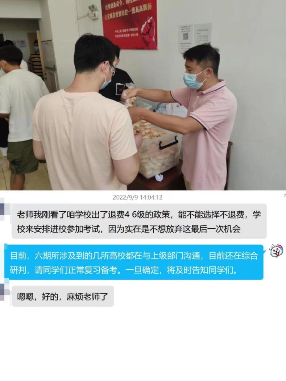 据悉,学院党政根据六期学生的实际需求和困难,第一时间组成学院领导、辅导员、住楼辅导员、学生骨干的保障小组,迅速调集人力、物力,协调划拨经费为学生采购急需的生活日用品和食品,联系后勤车辆及时把慰问物资送到学生手中,切实解决了同学们的燃眉之急,让同学们体会到了学院的关爱和温暖。在六期列为高风险当天,学院选派一名骨干辅导员驻守六期宿舍,与学生同吃同住,第一时间现场处置学生遇到的各类问题,及时疏导和安抚学生心理,为学生提供24小时全天候贴心服务。学院积极组织所有导师主动电话或信息关心带教学生,加强对学生的关心关爱,鼓励并指导学生继续做好科研工作,云端话学术,科研不停步。