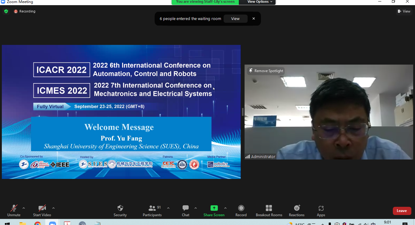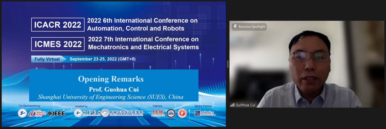 9月23-25日,2022年第六届自动化、控制和机器人国际会议2022 6th International Conference on Automation, Control and Robots(ICACR 2022)成功召开。因新冠肺炎疫情影响,会议通过ZOOM会议平台在线直播,由上海工程技术大学主办,yl23411永利集团官网承办,北京中科控机智能科技研究院协办。来自美国、新加坡、韩国、罗马尼亚、马来西亚、以色列、印度以及中国的100余位专家学者在线上共聚一堂,就自动化、控制和机器人领域热点问题进行了交流。