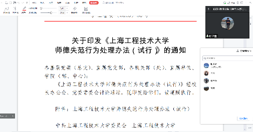 (2)认真学习了《上海工程技术大学师德考核实施办法》,对考核组织保障、年度师德考核内容及等级、年度师德考核程序、考核结果运用及考核监督等方面进行了说明。促使老师们自觉践行教师职业行为“十项准则”,提升教师职业道德修养,自觉担当起新时代教师培养德智体美劳全面发展的社会主义建设者和接班人的神圣使命。