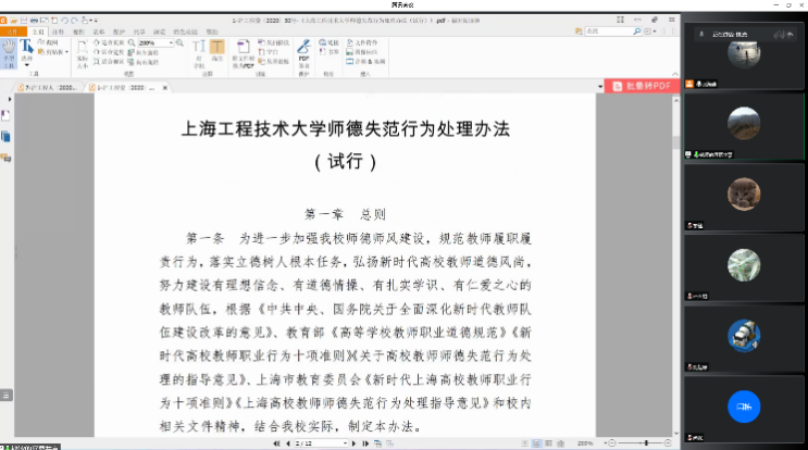 (5)集中学习了《上海工程技术大学教职工处分暂行规定》,分别在处分的分类、违法违纪行为及其适用的处分等方面做出了详细讨论。通过本次学习,教师们能够领会和把握《上海工程技术大学教职工处分暂行规定》的基本内容和精神实质,对关系到教师切身利益的条目,诸如学术不端行为、申报项目或荣誉等过程中弄虚作假行为的处分有了清晰的认识。通过学习,增强了教师们的纪律意识、责任意识和作风意识。