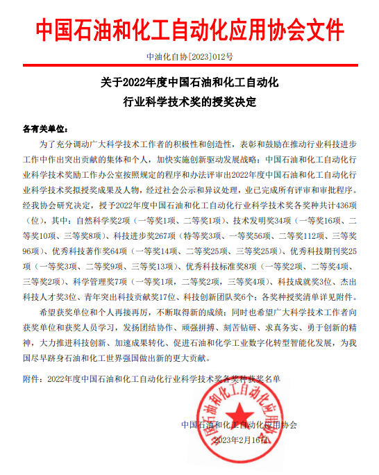 中国石油和化工自动化行业科学技术奖是经国家科学技术部批准(国科奖社证字第0109号)设立的面向全国范围的行业性科学技术奖项具有直接提名国学科学技术奖的资格。