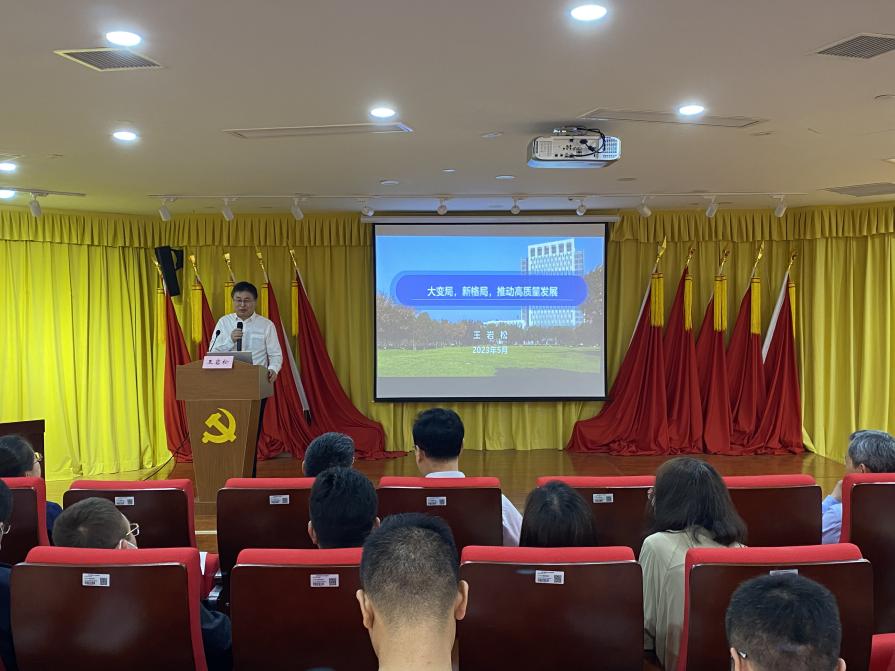 王校长以《大变局,新格局,推动高质量发展》为题,重点从世界危机带来变局、中国经济面临挑战、上海未来的发展走向、学校发展把握机遇四个方面进行了深入讲解。他强调党的二十大报告中提到:要加快实施创新驱动发展战略,深入实施人才强国战略,面对新形势新挑战,学校要紧扣高水平科技自立自强使命任务,积极融入长三角一体化经济发展,提升学科建设水平和人才培养质量,要深入学习领会习近平总书记关于科技创新的重要论述和重要指示批示精神,引导党员深刻领悟“两个确立”的决定性意义,自觉增强“四个意识”、坚定“四个自信”、做到“两个维护”,为学校教育事业发展做出更大贡献。