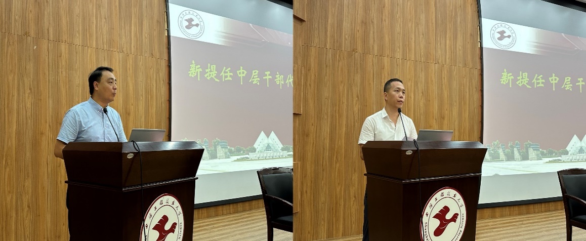 汽车工程系主任刘飞老师、机械制造系副主任霍元明老师作为新提任中层干部代表发言。两位老师的发言聚集党建引领、人才培养、科研工作开展、科技成果转化,阐述了系室未来的工作重点,表明了作为新任干部履责担当的决心。