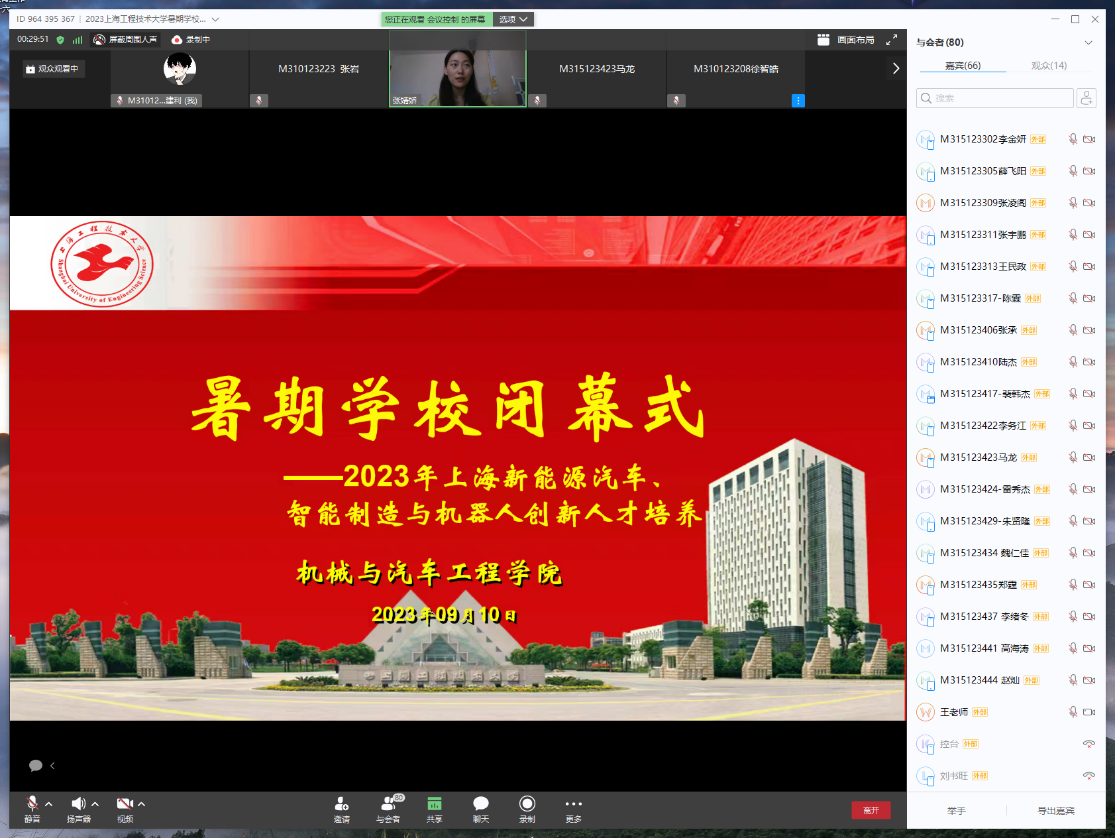 2023年9月10日下午,由上海市学位委员会主办,上海工程技术大学承办的2023年上海“新能源汽车、智能制造及机器人创新人才培养”研究生云端暑期学校风云榜评比活动暨结业典礼在华为云会议平台直播上如期举行。yl23411永利集团官网副院长刘新田教授、暑期学校全体学员、志愿者共200余人参加了结业典礼。结业典礼由yl23411永利集团官网张婧娇老师主持。