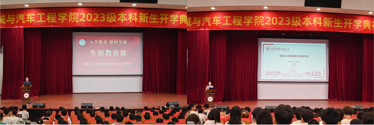 汽车服务工程系主任黄孝慈和机械电子工程系主任朱姿娜分别从“三融、三进、三闭环”的教学理念和学科发展历程、前沿技术应用的角度阐述了思政元素融入课堂、教材和实践的生动案例,以讲授课程思政的方式鼓励新生投身创新实践、担当时代使命。