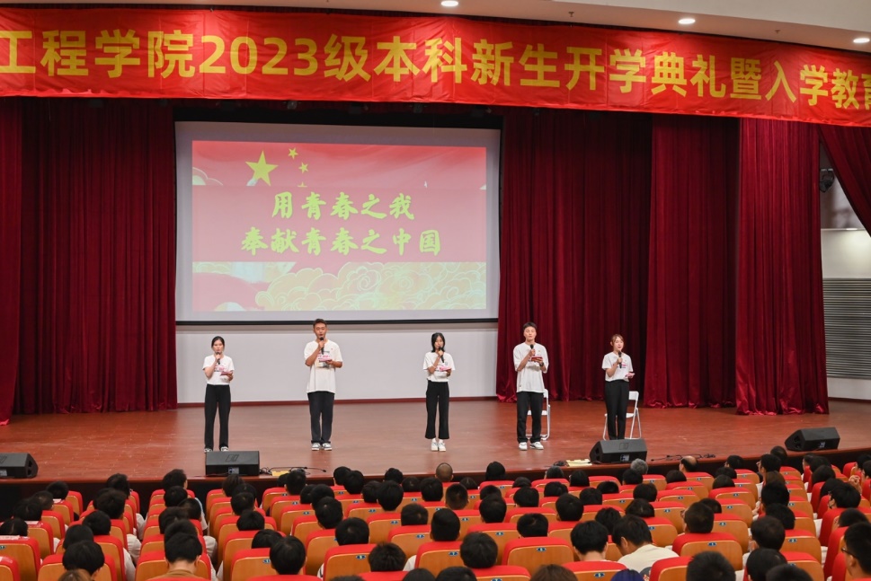 不同于以往的常规议程,此次开学典礼暨入学教育是以一堂思政大课的形式向新生们呈现。这堂大课共包括六节小课,分别从院史教育、讲师团宣讲、课程思政、生涯教育、青年风采和入党启蒙教育等多个角度,为同学们带来了一场精彩生动的“全景式”“沉浸式”思政大课。典礼在庄严肃穆的国歌声中正式开始。