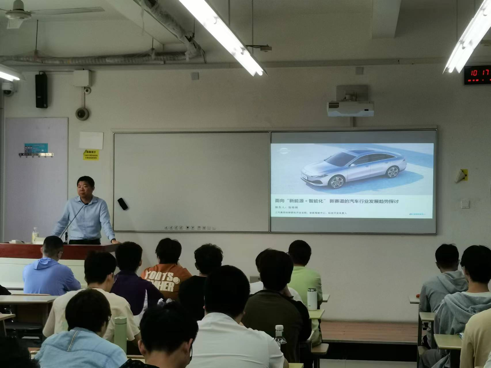 本次授课专家为上汽研发总院智驾中心高级工程师张栋林,张栋林高工以面向“新能源+智能化”新赛道的汽车行业发展现状入题,从上汽底盘开发情况、自动驾驶汽车的形态演进及未来的发展趋势三个方面向车辆工程专业的学生进行了详实的讲解。重点分析了传统机械车辆、电控自动车辆、智能网联车辆、自动驾驶车辆等形态演变过程及演变中的机械动力素质、电气通讯素质、信息交互素质、移动空间素质不断进阶。勉励大家要拓展知识维度,开阔知识宽度,提高技术发展态势分析能力。