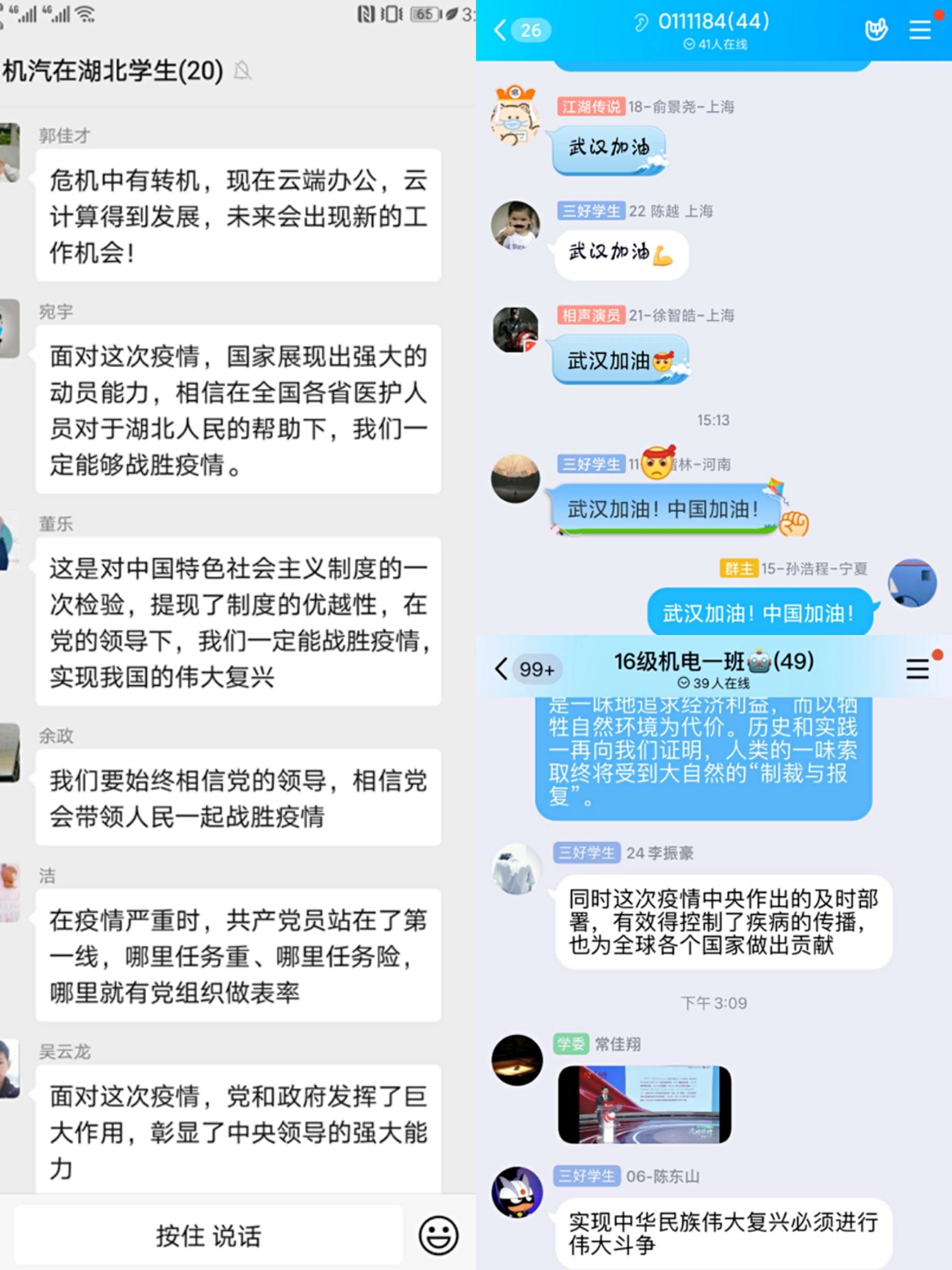 0111163班党员学生李亮谈到:“今天的《全国大学生同上一堂疫情防控思政大课》令我受益匪浅,刻骨铭心。这次新冠肺炎疫情,正如秦宣教授所说的一个词——‘多难兴邦’。中华民族就是在这样的环境中不断艰苦奋斗站起来的。在面对突如其来的疫情,一方有难八方支援,无数国人逆流而上冲锋在防疫第一线。武汉在爆发疫情以后,湖南省委快速反应决策封城,有效抑制了疫情扩散,一个国家能有如此果断的执行力和判断力,将一千多**口大都市封城,体现出的制度的优越性,这是其他制度其他政党无法企及的。这次疫情,更让我热泪盈眶的一种精神,是“家国情怀”。国家栽培了我们,我们也应该在国家需要我的时候挺身而出,‘17年前你们保护我们,现在我们来保护你们’!”