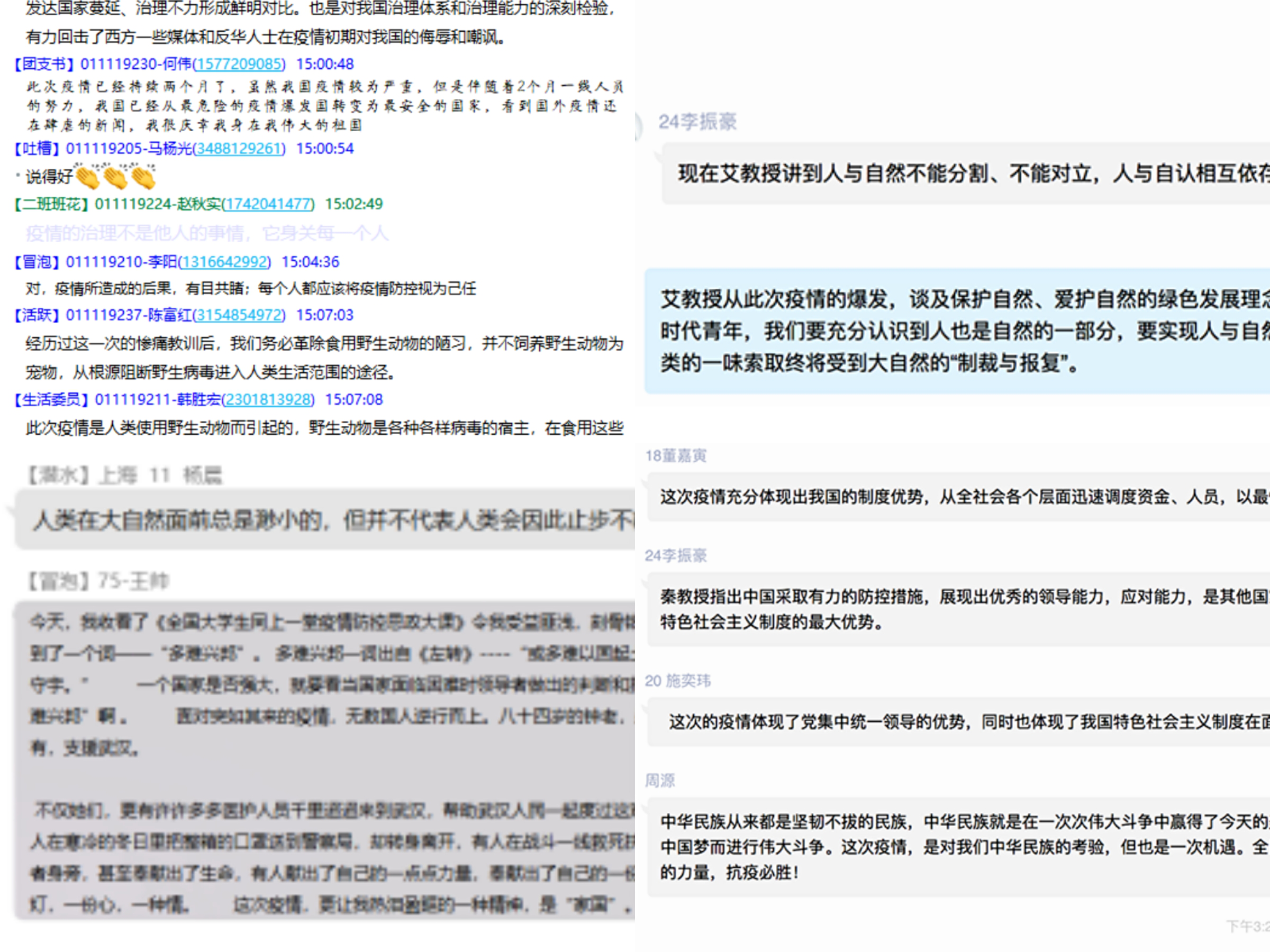 本次疫情防控思政大课在广大师生中引起巨大反响,同学们对于以习近平为核心的党中央关于疫情防控的决策部署、中国抗疫彰显的中国共产党领导和中国特色社会主义制度的显著优势有了更为深刻的认识,也在防疫战疫感人故事的感召下,纷纷立志勇担时代使命,将青春梦想扎根祖国的广袤大地。
