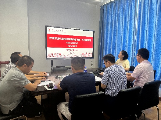 July 26, 2023, Shenzhen Institute of Vocational Technology Mechanical and Electrical College Wang Wenbin, vice president, led by industrial robotics professional Zhao Wei director and branch secretary Song Zhendong teacher and his party of three people visited our mechanical and electronic engineering department for research and exchange, Department of Mechanical and Electrical Director Zhu Zina, deputy director Lai Leijie, Chen Saixuan, teacher representatives Zhou Zhifeng teacher to participate in this exchange of symposium, this research will be presided over by Mr. Zhu Zina, branch on the The research meeting was hosted by Ms. Zhu Zina, and in-depth exchanges were conducted on three aspects: branch construction, professional situation, and dual-creation education.