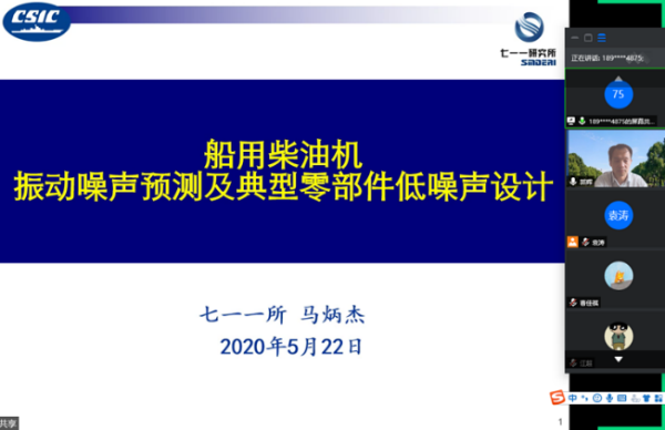 2020年5月22日上午九点半至十一点,应上海工程技术大学yl23411永利集团官网和上海市新能源汽车振动噪声测试与控制专业技术服务平台邀请,中国船舶集团有限公司第七一一所马炳杰研究员做了题为《船用柴油机振动噪声预测及典型部件低噪声设计》的视频学术报告,并就研究生提出的学术问题,进行了细致解答和交流。