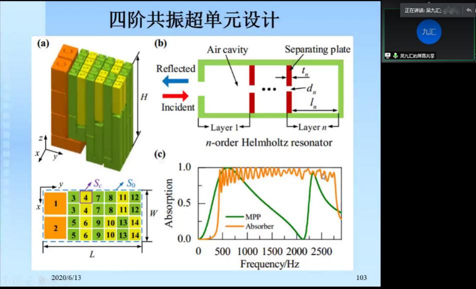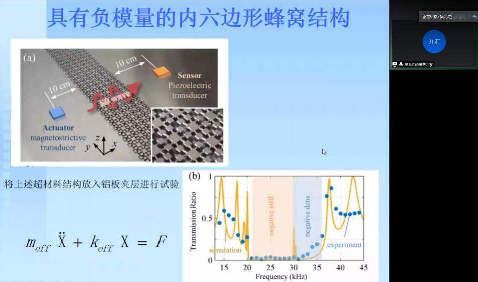 2020年6月13日上午,应上海工程技术大学yl23411永利集团官网和上海市新能源汽车振动噪声测试与控制专业技术服务平台邀请,西安交通大学教授、博士生导师吴九汇教授做了题为《声学超材料的小尺寸大宽带吸声机理及应用》的视频学术报告,并就研究生提出的学术问题,进行了细致解答和交流。学院副院长、平台副主任郭辉老师代表学院和平台,对吴九汇教授的到来表示了热烈欢迎。