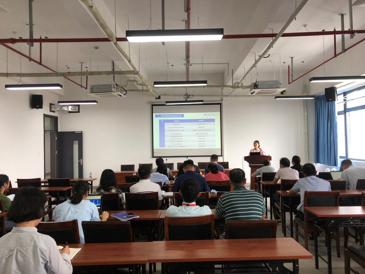 接下来,由研究生秘书程福荣老师为导师详细介绍了研究生指导过程中的工作流程,就研究生招生、培养、学位、过程管理这四大模块里涉及到的具体事项和具体时间做了详尽而全面地讲解。