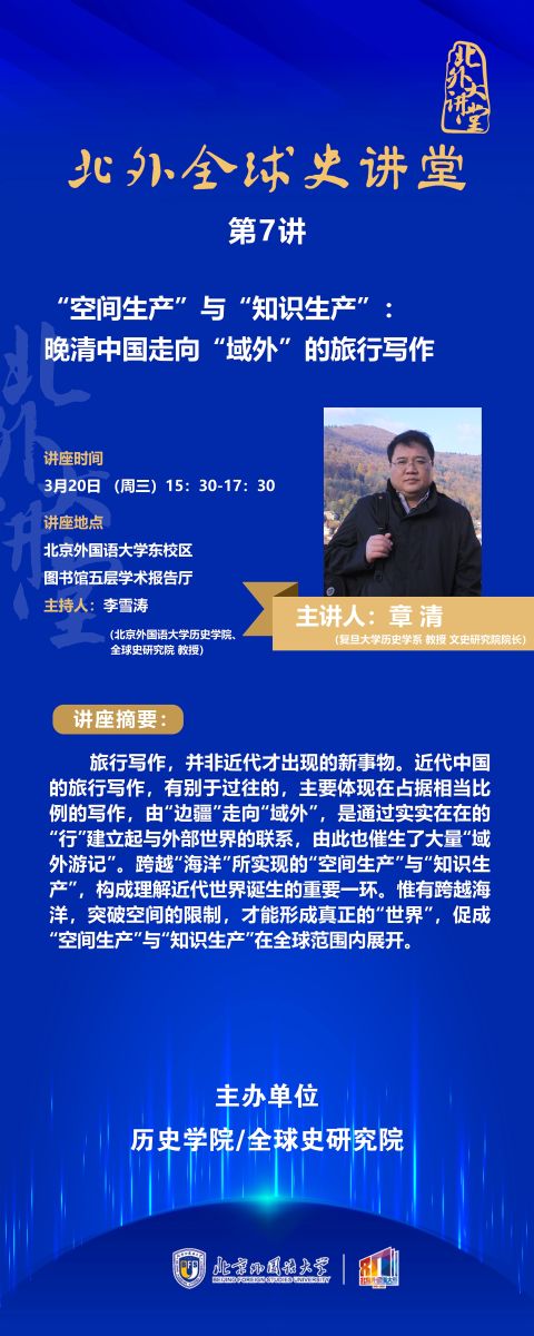 2024年3月20日 在北外图书馆学术报告厅成功举办了《“空间生产”与“知识生产”:晚清中国走向“域外”的旅行写作》的讲座。beat365正版唯一官网院长李雪涛教授主持了这场讲座, 首先简单介绍了复旦大学历史学系、文史研究院院长章清教授研究领域及成果,然后大家倾听了章清教授精彩的报告, 最后的互动环节,与会者积极参与讨论,章清教授给予北外的学子们掌握好外语在今后的历史研究领域发挥更大的作用。