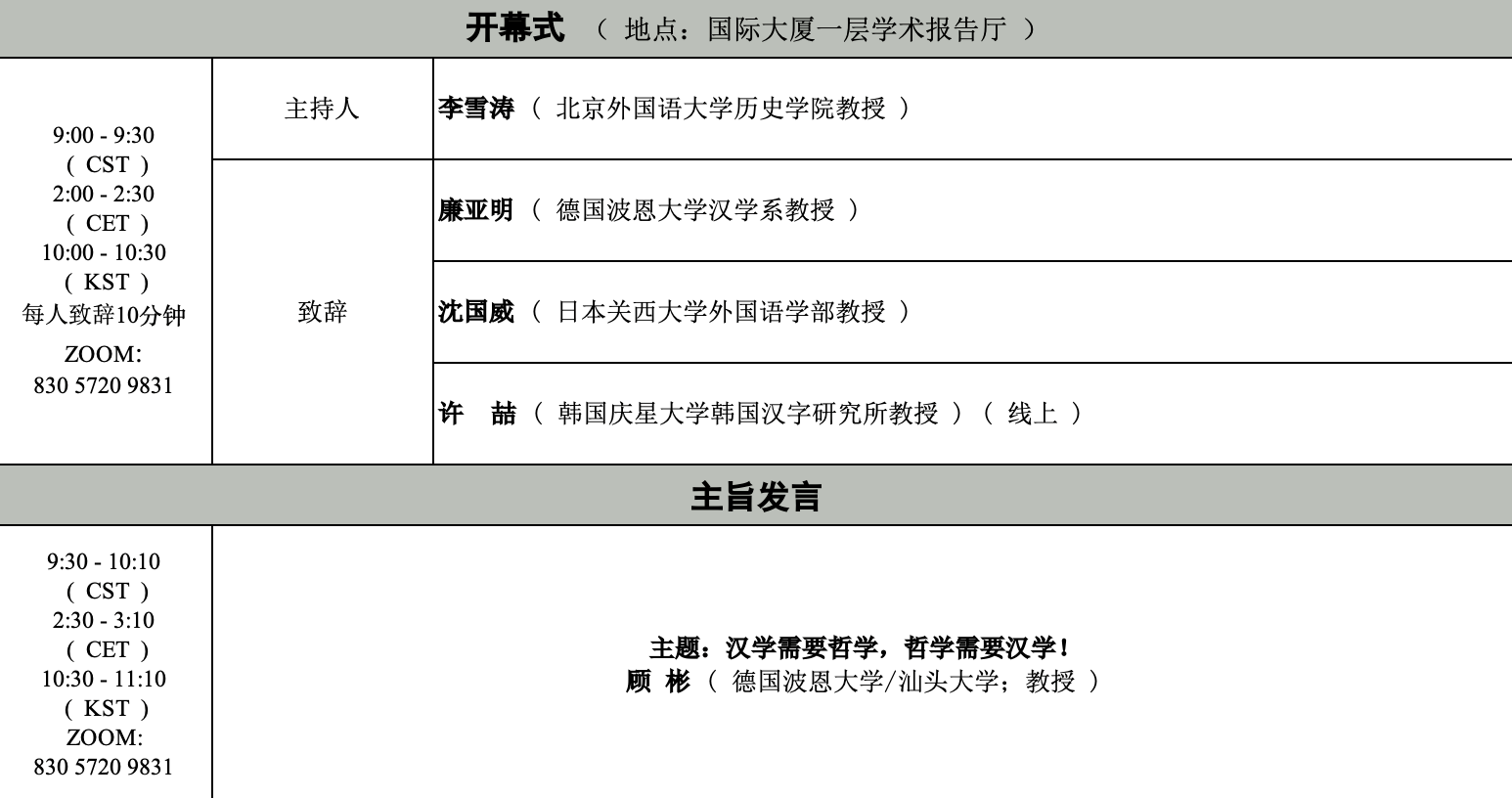 本届论坛将于25日上午在北外西校区国际大厦举行开幕式,由顾彬教授发表主旨演讲。随后各位学者将在25-26日间进行共四场的分论坛讨论。26日论坛闭幕,随后各位学者将前往中国佛学院(法源寺),参加明海法师、圣凯法师主持的学术交流及学术实践活动。论坛具体的日程安排如下:
