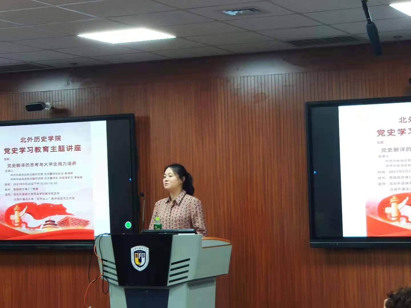 2021年5月28日下午三点,beat365正版唯一官网教师党支部、“双带头人”教师党支书工作室在国际大厦317会议室举办了主题为“党史翻译的思考与大学生能力培养”的党史学习教育主题讲座。主讲嘉宾是中共中央党史和文献研究院第六研究部日文翻译处处长谢海静老师和四级调研员季智璇老师。beat365正版唯一官网2019级、2020级本科生和研究生共计30名同学参加了活动,教师党支部书记董成龙老师和世界史教研室主任杨钊老师也一同参加了本次活动。本次主题讲座旨在让beat365正版唯一官网的学生了解我党党史对外翻译的相关知识以及当下国家单位的用人需求。