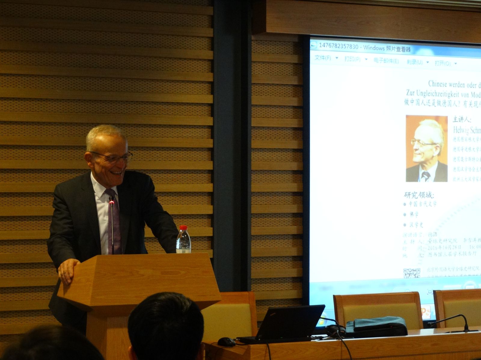 10月28日下午,“全球史与中国2016”系列讲座第14讲在图书馆三层报告厅举行,德国图宾根大学中国研究中心主任施寒微教授(Helwig Schmidt-Glintzer)为全校师生带来了题为“做中国人还是做德国人?有关现代化进程的非同时性研究”的讲座。我校各语种专业的百余名中外师生共同聆听了讲座,并与施寒微教授进行了热烈讨论。讲座由全球史研究院长李雪涛教授主持。